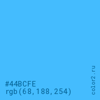 Цвет #44BCFE в цветовой модели RGB обозначается тремя октетами (68, 188, 254) в десятичном формате и #44BCFE в шестнадцатиричном (hex) формате, которые являются интенсивностью красного 68 (hex 44), интенсивность зелёного 188 (hex BC) и интенсивность синего 254 (hex FE).