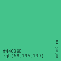 Цвет #44C38B в цветовой модели RGB обозначается тремя октетами (68, 195, 139) в десятичном формате и #44C38B в шестнадцатиричном (hex) формате, которые являются интенсивностью красного 68 (hex 44), интенсивность зелёного 195 (hex C3) и интенсивность синего 139 (hex 8B).
