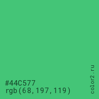 Цвет #44C577 в цветовой модели RGB обозначается тремя октетами (68, 197, 119) в десятичном формате и #44C577 в шестнадцатиричном (hex) формате, которые являются интенсивностью красного 68 (hex 44), интенсивность зелёного 197 (hex C5) и интенсивность синего 119 (hex 77).