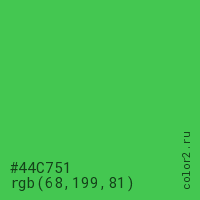 Цвет #44C751 в цветовой модели RGB обозначается тремя октетами (68, 199, 81) в десятичном формате и #44C751 в шестнадцатиричном (hex) формате, которые являются интенсивностью красного 68 (hex 44), интенсивность зелёного 199 (hex C7) и интенсивность синего 81 (hex 51).