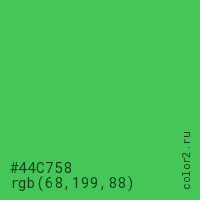 Цвет #44C758 в цветовой модели RGB обозначается тремя октетами (68, 199, 88) в десятичном формате и #44C758 в шестнадцатиричном (hex) формате, которые являются интенсивностью красного 68 (hex 44), интенсивность зелёного 199 (hex C7) и интенсивность синего 88 (hex 58).
