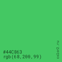 Цвет #44C863 в цветовой модели RGB обозначается тремя октетами (68, 200, 99) в десятичном формате и #44C863 в шестнадцатиричном (hex) формате, которые являются интенсивностью красного 68 (hex 44), интенсивность зелёного 200 (hex C8) и интенсивность синего 99 (hex 63).