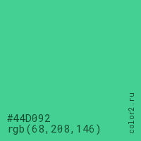 Цвет #44D092 в цветовой модели RGB обозначается тремя октетами (68, 208, 146) в десятичном формате и #44D092 в шестнадцатиричном (hex) формате, которые являются интенсивностью красного 68 (hex 44), интенсивность зелёного 208 (hex D0) и интенсивность синего 146 (hex 92).