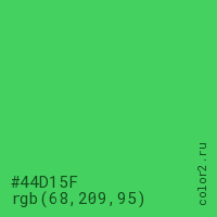 Цвет #44D15F в цветовой модели RGB обозначается тремя октетами (68, 209, 95) в десятичном формате и #44D15F в шестнадцатиричном (hex) формате, которые являются интенсивностью красного 68 (hex 44), интенсивность зелёного 209 (hex D1) и интенсивность синего 95 (hex 5F).