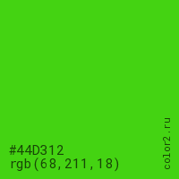 Цвет #44D312 в цветовой модели RGB обозначается тремя октетами (68, 211, 18) в десятичном формате и #44D312 в шестнадцатиричном (hex) формате, которые являются интенсивностью красного 68 (hex 44), интенсивность зелёного 211 (hex D3) и интенсивность синего 18 (hex 12).