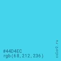 Цвет #44D4EC в цветовой модели RGB обозначается тремя октетами (68, 212, 236) в десятичном формате и #44D4EC в шестнадцатиричном (hex) формате, которые являются интенсивностью красного 68 (hex 44), интенсивность зелёного 212 (hex D4) и интенсивность синего 236 (hex EC).