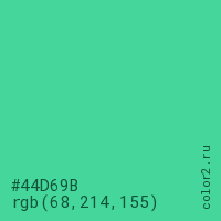 Цвет #44D69B в цветовой модели RGB обозначается тремя октетами (68, 214, 155) в десятичном формате и #44D69B в шестнадцатиричном (hex) формате, которые являются интенсивностью красного 68 (hex 44), интенсивность зелёного 214 (hex D6) и интенсивность синего 155 (hex 9B).