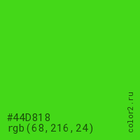 Цвет #44D818 в цветовой модели RGB обозначается тремя октетами (68, 216, 24) в десятичном формате и #44D818 в шестнадцатиричном (hex) формате, которые являются интенсивностью красного 68 (hex 44), интенсивность зелёного 216 (hex D8) и интенсивность синего 24 (hex 18).