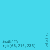Цвет #44D8EB в цветовой модели RGB обозначается тремя октетами (68, 216, 235) в десятичном формате и #44D8EB в шестнадцатиричном (hex) формате, которые являются интенсивностью красного 68 (hex 44), интенсивность зелёного 216 (hex D8) и интенсивность синего 235 (hex EB).
