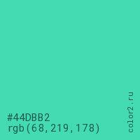 Цвет #44DBB2 в цветовой модели RGB обозначается тремя октетами (68, 219, 178) в десятичном формате и #44DBB2 в шестнадцатиричном (hex) формате, которые являются интенсивностью красного 68 (hex 44), интенсивность зелёного 219 (hex DB) и интенсивность синего 178 (hex B2).