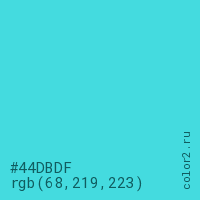 Цвет #44DBDF в цветовой модели RGB обозначается тремя октетами (68, 219, 223) в десятичном формате и #44DBDF в шестнадцатиричном (hex) формате, которые являются интенсивностью красного 68 (hex 44), интенсивность зелёного 219 (hex DB) и интенсивность синего 223 (hex DF).