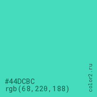 Цвет #44DCBC в цветовой модели RGB обозначается тремя октетами (68, 220, 188) в десятичном формате и #44DCBC в шестнадцатиричном (hex) формате, которые являются интенсивностью красного 68 (hex 44), интенсивность зелёного 220 (hex DC) и интенсивность синего 188 (hex BC).
