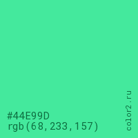 Цвет #44E99D в цветовой модели RGB обозначается тремя октетами (68, 233, 157) в десятичном формате и #44E99D в шестнадцатиричном (hex) формате, которые являются интенсивностью красного 68 (hex 44), интенсивность зелёного 233 (hex E9) и интенсивность синего 157 (hex 9D).