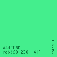 Цвет #44EE8D в цветовой модели RGB обозначается тремя октетами (68, 238, 141) в десятичном формате и #44EE8D в шестнадцатиричном (hex) формате, которые являются интенсивностью красного 68 (hex 44), интенсивность зелёного 238 (hex EE) и интенсивность синего 141 (hex 8D).