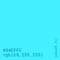 Цвет #44EFFF в цветовой модели RGB обозначается тремя октетами (68, 239, 255) в десятичном формате и #44EFFF в шестнадцатиричном (hex) формате, которые являются интенсивностью красного 68 (hex 44), интенсивность зелёного 239 (hex EF) и интенсивность синего 255 (hex FF).