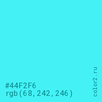 Цвет #44F2F6 в цветовой модели RGB обозначается тремя октетами (68, 242, 246) в десятичном формате и #44F2F6 в шестнадцатиричном (hex) формате, которые являются интенсивностью красного 68 (hex 44), интенсивность зелёного 242 (hex F2) и интенсивность синего 246 (hex F6).