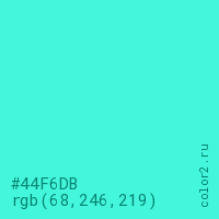 Цвет #44F6DB в цветовой модели RGB обозначается тремя октетами (68, 246, 219) в десятичном формате и #44F6DB в шестнадцатиричном (hex) формате, которые являются интенсивностью красного 68 (hex 44), интенсивность зелёного 246 (hex F6) и интенсивность синего 219 (hex DB).