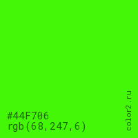 Цвет #44F706 в цветовой модели RGB обозначается тремя октетами (68, 247, 6) в десятичном формате и #44F706 в шестнадцатиричном (hex) формате, которые являются интенсивностью красного 68 (hex 44), интенсивность зелёного 247 (hex F7) и интенсивность синего 6 (hex 06).