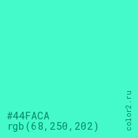 Цвет #44FACA в цветовой модели RGB обозначается тремя октетами (68, 250, 202) в десятичном формате и #44FACA в шестнадцатиричном (hex) формате, которые являются интенсивностью красного 68 (hex 44), интенсивность зелёного 250 (hex FA) и интенсивность синего 202 (hex CA).