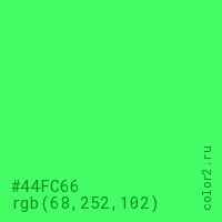 Цвет #44FC66 в цветовой модели RGB обозначается тремя октетами (68, 252, 102) в десятичном формате и #44FC66 в шестнадцатиричном (hex) формате, которые являются интенсивностью красного 68 (hex 44), интенсивность зелёного 252 (hex FC) и интенсивность синего 102 (hex 66).