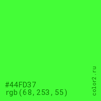 Цвет #44FD37 в цветовой модели RGB обозначается тремя октетами (68, 253, 55) в десятичном формате и #44FD37 в шестнадцатиричном (hex) формате, которые являются интенсивностью красного 68 (hex 44), интенсивность зелёного 253 (hex FD) и интенсивность синего 55 (hex 37).