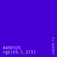 Цвет #4501D5 в цветовой модели RGB обозначается тремя октетами (69, 1, 213) в десятичном формате и #4501D5 в шестнадцатиричном (hex) формате, которые являются интенсивностью красного 69 (hex 45), интенсивность зелёного 1 (hex 01) и интенсивность синего 213 (hex D5).