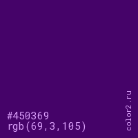 Цвет #450369 в цветовой модели RGB обозначается тремя октетами (69, 3, 105) в десятичном формате и #450369 в шестнадцатиричном (hex) формате, которые являются интенсивностью красного 69 (hex 45), интенсивность зелёного 3 (hex 03) и интенсивность синего 105 (hex 69).