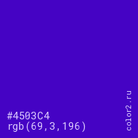 Цвет #4503C4 в цветовой модели RGB обозначается тремя октетами (69, 3, 196) в десятичном формате и #4503C4 в шестнадцатиричном (hex) формате, которые являются интенсивностью красного 69 (hex 45), интенсивность зелёного 3 (hex 03) и интенсивность синего 196 (hex C4).