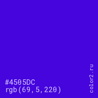 Цвет #4505DC в цветовой модели RGB обозначается тремя октетами (69, 5, 220) в десятичном формате и #4505DC в шестнадцатиричном (hex) формате, которые являются интенсивностью красного 69 (hex 45), интенсивность зелёного 5 (hex 05) и интенсивность синего 220 (hex DC).