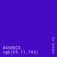 Цвет #450BC3 в цветовой модели RGB обозначается тремя октетами (69, 11, 195) в десятичном формате и #450BC3 в шестнадцатиричном (hex) формате, которые являются интенсивностью красного 69 (hex 45), интенсивность зелёного 11 (hex 0B) и интенсивность синего 195 (hex C3).