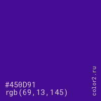 Цвет #450D91 в цветовой модели RGB обозначается тремя октетами (69, 13, 145) в десятичном формате и #450D91 в шестнадцатиричном (hex) формате, которые являются интенсивностью красного 69 (hex 45), интенсивность зелёного 13 (hex 0D) и интенсивность синего 145 (hex 91).