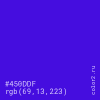 Цвет #450DDF в цветовой модели RGB обозначается тремя октетами (69, 13, 223) в десятичном формате и #450DDF в шестнадцатиричном (hex) формате, которые являются интенсивностью красного 69 (hex 45), интенсивность зелёного 13 (hex 0D) и интенсивность синего 223 (hex DF).