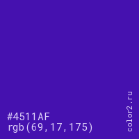 Цвет #4511AF в цветовой модели RGB обозначается тремя октетами (69, 17, 175) в десятичном формате и #4511AF в шестнадцатиричном (hex) формате, которые являются интенсивностью красного 69 (hex 45), интенсивность зелёного 17 (hex 11) и интенсивность синего 175 (hex AF).