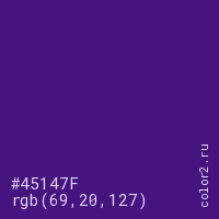 Цвет #45147F в цветовой модели RGB обозначается тремя октетами (69, 20, 127) в десятичном формате и #45147F в шестнадцатиричном (hex) формате, которые являются интенсивностью красного 69 (hex 45), интенсивность зелёного 20 (hex 14) и интенсивность синего 127 (hex 7F).