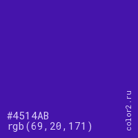 Цвет #4514AB в цветовой модели RGB обозначается тремя октетами (69, 20, 171) в десятичном формате и #4514AB в шестнадцатиричном (hex) формате, которые являются интенсивностью красного 69 (hex 45), интенсивность зелёного 20 (hex 14) и интенсивность синего 171 (hex AB).