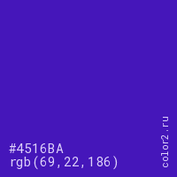 Цвет #4516BA в цветовой модели RGB обозначается тремя октетами (69, 22, 186) в десятичном формате и #4516BA в шестнадцатиричном (hex) формате, которые являются интенсивностью красного 69 (hex 45), интенсивность зелёного 22 (hex 16) и интенсивность синего 186 (hex BA).
