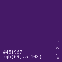 Цвет #451967 в цветовой модели RGB обозначается тремя октетами (69, 25, 103) в десятичном формате и #451967 в шестнадцатиричном (hex) формате, которые являются интенсивностью красного 69 (hex 45), интенсивность зелёного 25 (hex 19) и интенсивность синего 103 (hex 67).