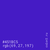 Цвет #451BC5 в цветовой модели RGB обозначается тремя октетами (69, 27, 197) в десятичном формате и #451BC5 в шестнадцатиричном (hex) формате, которые являются интенсивностью красного 69 (hex 45), интенсивность зелёного 27 (hex 1B) и интенсивность синего 197 (hex C5).