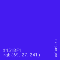 Цвет #451BF1 в цветовой модели RGB обозначается тремя октетами (69, 27, 241) в десятичном формате и #451BF1 в шестнадцатиричном (hex) формате, которые являются интенсивностью красного 69 (hex 45), интенсивность зелёного 27 (hex 1B) и интенсивность синего 241 (hex F1).