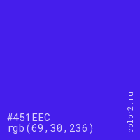 Цвет #451EEC в цветовой модели RGB обозначается тремя октетами (69, 30, 236) в десятичном формате и #451EEC в шестнадцатиричном (hex) формате, которые являются интенсивностью красного 69 (hex 45), интенсивность зелёного 30 (hex 1E) и интенсивность синего 236 (hex EC).