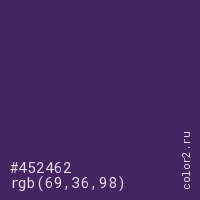 Цвет #452462 в цветовой модели RGB обозначается тремя октетами (69, 36, 98) в десятичном формате и #452462 в шестнадцатиричном (hex) формате, которые являются интенсивностью красного 69 (hex 45), интенсивность зелёного 36 (hex 24) и интенсивность синего 98 (hex 62).