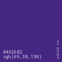 Цвет #452682 в цветовой модели RGB обозначается тремя октетами (69, 38, 130) в десятичном формате и #452682 в шестнадцатиричном (hex) формате, которые являются интенсивностью красного 69 (hex 45), интенсивность зелёного 38 (hex 26) и интенсивность синего 130 (hex 82).