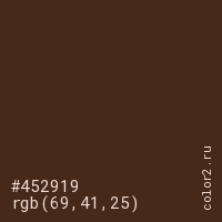 Цвет #452919 в цветовой модели RGB обозначается тремя октетами (69, 41, 25) в десятичном формате и #452919 в шестнадцатиричном (hex) формате, которые являются интенсивностью красного 69 (hex 45), интенсивность зелёного 41 (hex 29) и интенсивность синего 25 (hex 19).