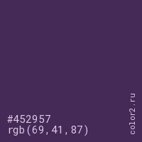 Цвет #452957 в цветовой модели RGB обозначается тремя октетами (69, 41, 87) в десятичном формате и #452957 в шестнадцатиричном (hex) формате, которые являются интенсивностью красного 69 (hex 45), интенсивность зелёного 41 (hex 29) и интенсивность синего 87 (hex 57).