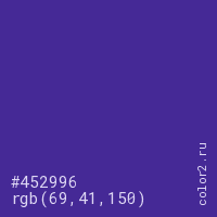 Цвет #452996 в цветовой модели RGB обозначается тремя октетами (69, 41, 150) в десятичном формате и #452996 в шестнадцатиричном (hex) формате, которые являются интенсивностью красного 69 (hex 45), интенсивность зелёного 41 (hex 29) и интенсивность синего 150 (hex 96).