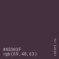 Цвет #45303F в цветовой модели RGB обозначается тремя октетами (69, 48, 63) в десятичном формате и #45303F в шестнадцатиричном (hex) формате, которые являются интенсивностью красного 69 (hex 45), интенсивность зелёного 48 (hex 30) и интенсивность синего 63 (hex 3F).