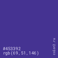 Цвет #453392 в цветовой модели RGB обозначается тремя октетами (69, 51, 146) в десятичном формате и #453392 в шестнадцатиричном (hex) формате, которые являются интенсивностью красного 69 (hex 45), интенсивность зелёного 51 (hex 33) и интенсивность синего 146 (hex 92).