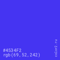Цвет #4534F2 в цветовой модели RGB обозначается тремя октетами (69, 52, 242) в десятичном формате и #4534F2 в шестнадцатиричном (hex) формате, которые являются интенсивностью красного 69 (hex 45), интенсивность зелёного 52 (hex 34) и интенсивность синего 242 (hex F2).