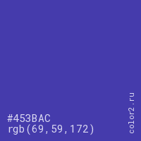 Цвет #453BAC в цветовой модели RGB обозначается тремя октетами (69, 59, 172) в десятичном формате и #453BAC в шестнадцатиричном (hex) формате, которые являются интенсивностью красного 69 (hex 45), интенсивность зелёного 59 (hex 3B) и интенсивность синего 172 (hex AC).