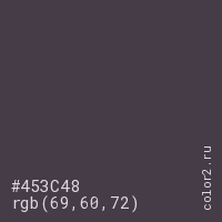 Цвет #453C48 в цветовой модели RGB обозначается тремя октетами (69, 60, 72) в десятичном формате и #453C48 в шестнадцатиричном (hex) формате, которые являются интенсивностью красного 69 (hex 45), интенсивность зелёного 60 (hex 3C) и интенсивность синего 72 (hex 48).